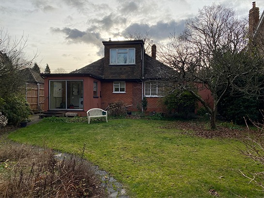 The initial property was a “chalet-style” bungalow, nestled within a picturesque garden. While the garden was a beautiful asset the client was keen to retain, the house itself was pretty dated and didn’t fit in with the more modern, larger properties in the neighbourhood. It had a cramped, compartmentalised layout with small rooms and poor outdoor connectivity, feeling more like a box dropped into the landscape than an integral part of it. It also didn’t meet current building regulations.